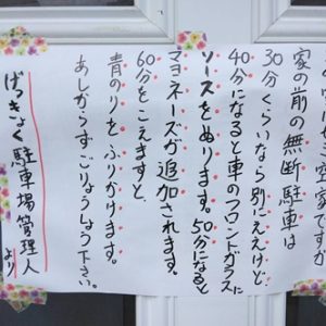 お店の駐車場は、お店右横の通路です。 ちょっと狭いのですよね。 お店を建てた頃は、まだみなさんの持ち車もそんなに大きくない頃でした。 ちょっと入りにくい人は、横の白い家の前も駐車してください。 うちの本宅なんで。父が住ん…