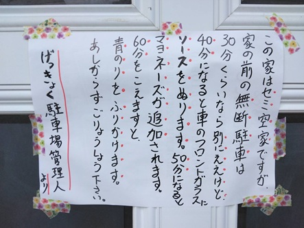 家の前にこんな貼り紙もありますが、洒落ですので、